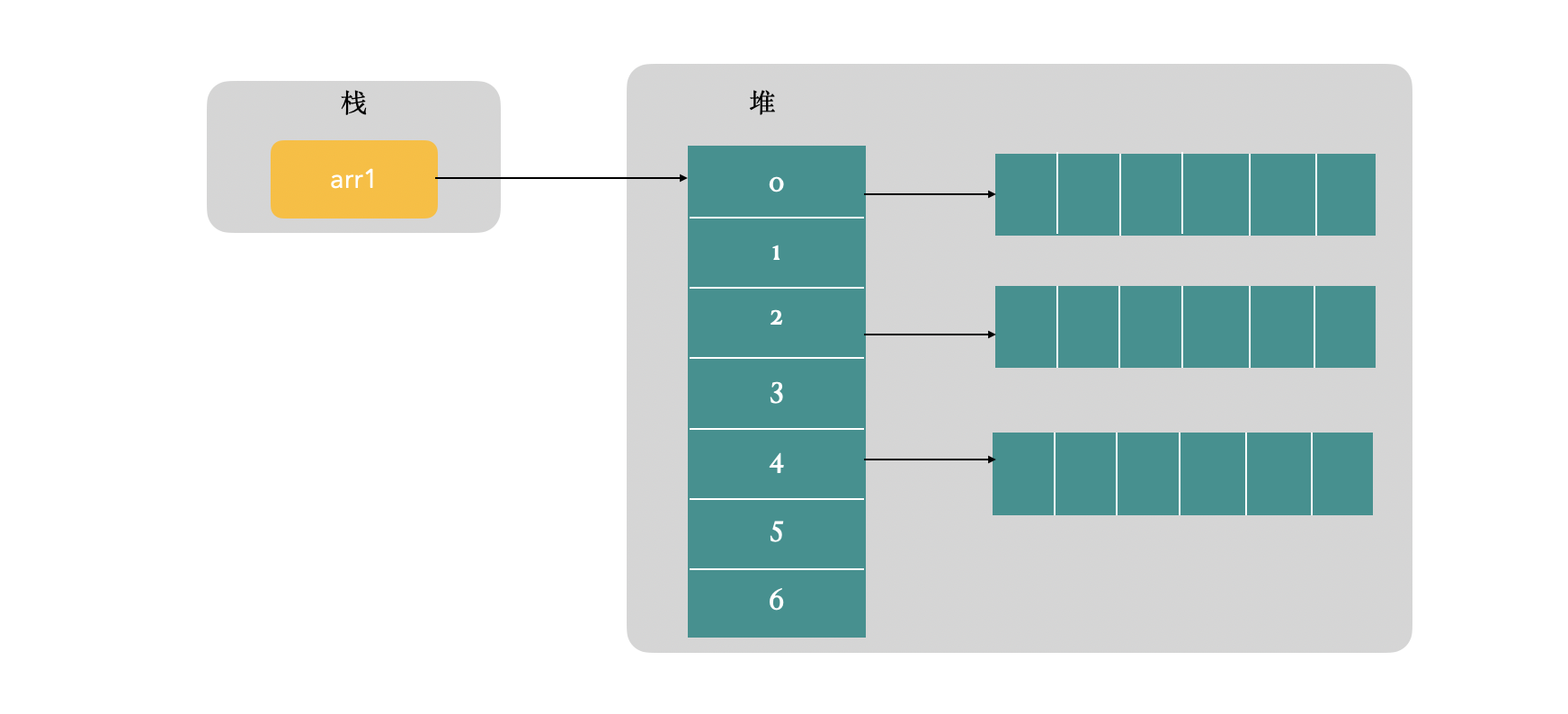 所以对于一维数组来说,就是如下的结构,栈中变量保存指向数组实例的引用。