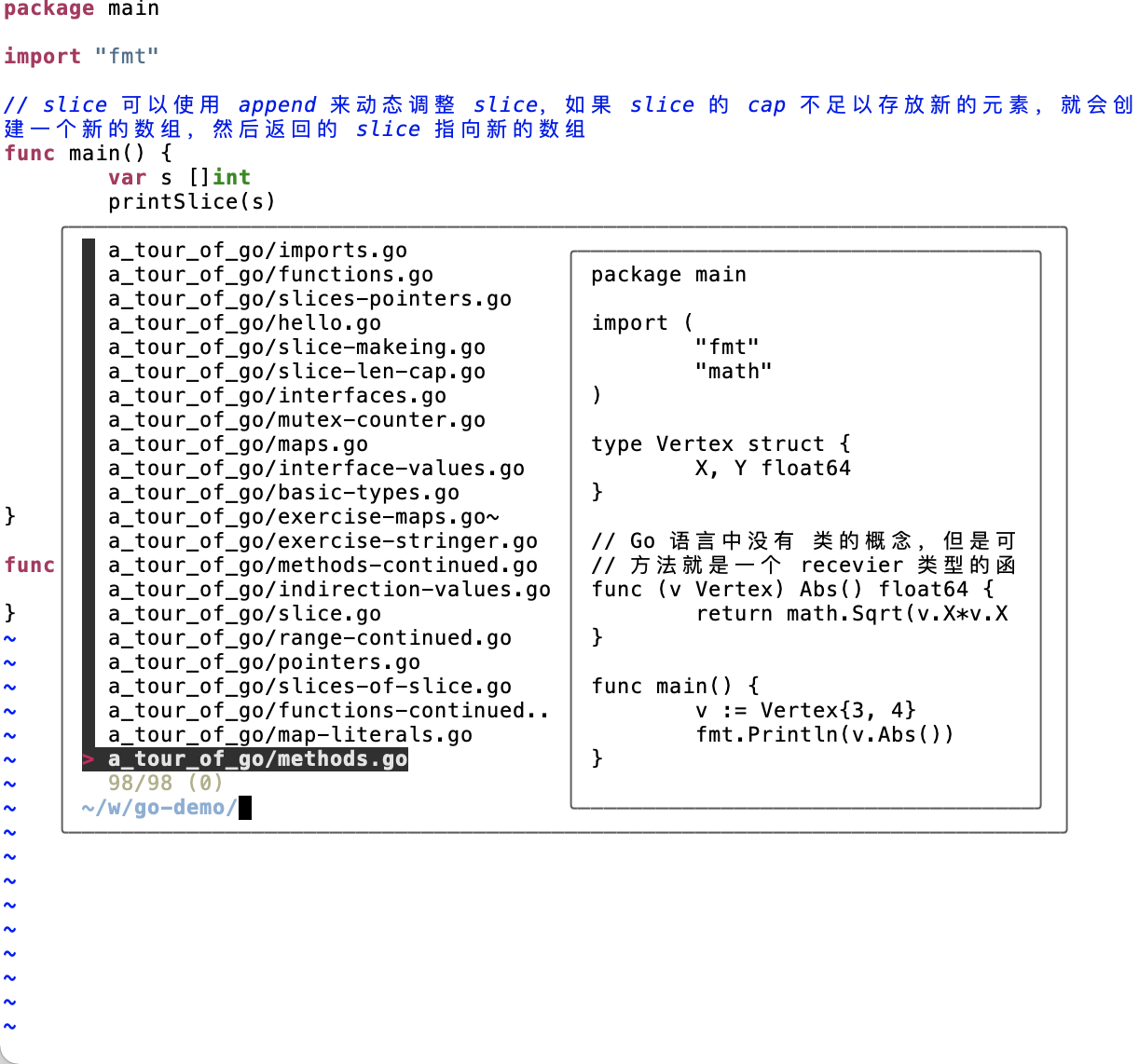 vim 中的命令与命令行稍微有点差别,对 fzf 的使用做了一些简单的封装,这样就不用做更多的配置。