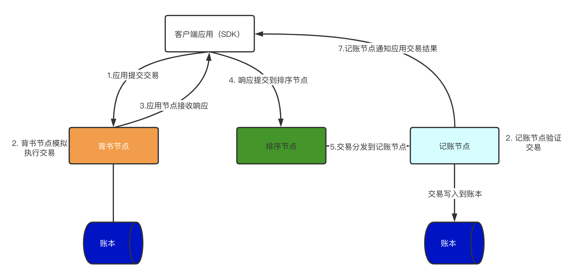 客户端会提交交易请求到背书节点,背书节点开始模拟执行交易,在模拟执行之后,背书节点并不会去更新账本数据,而是把这个交易进行加密和签名,然后返回给客户端。
