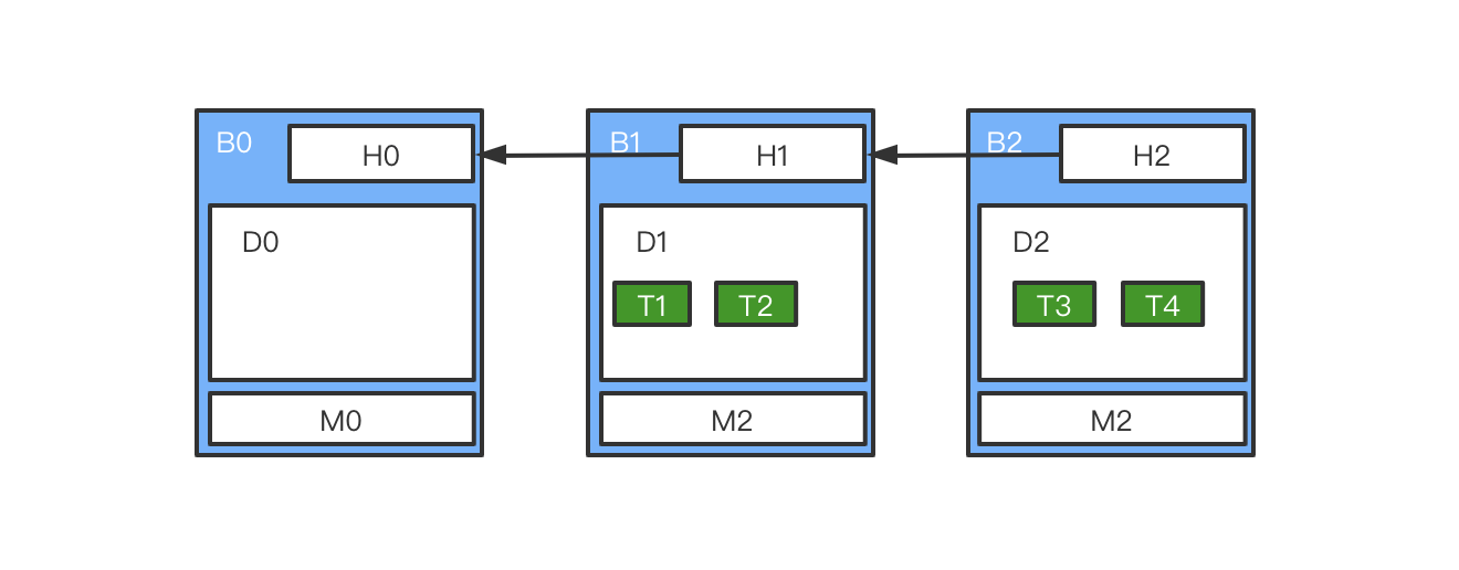 第一个区块被称之为 genesis block,其中不存储交易信息。每个区块可以被分为区块头、区块数据和区块元数据。区块头中存储着当前区块的区块号、当前区块的 hash 值和上一个区块的 hash 值,这样才能把所有的区块连接起来。区块数据中包含了交易数据。区块元数据中则包括了区块写入的时间、写入人及签名。