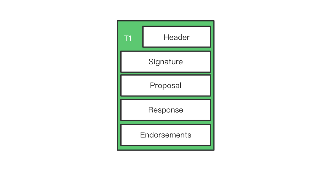 其中每一笔交易的结构如下,在 Header 中,包含了 ChainCode 的名称、版本信息。Signature 就是交易发起用户的签名。Proposal 中主要是一些参数。Response 中是智能合约执行的结果。Endorsements 中是背书结果返回的结果。