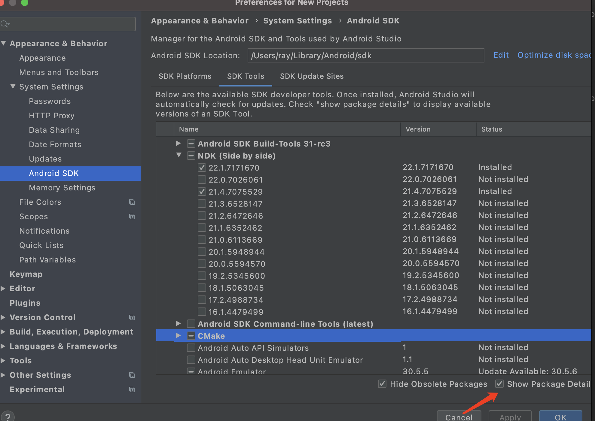 通过 Android Studio 的 SDK manager 下载 NDK 和 CMake,选中右下角的 Show Package Details 可以下载特定版本。