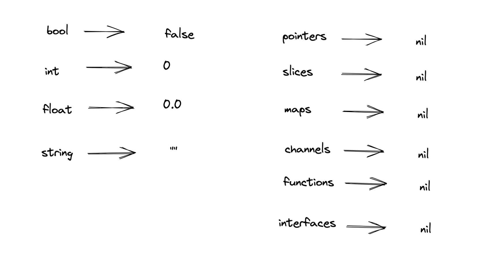 也不是所有类型的零值都是 nil,Go 中不同类型的零值如下: