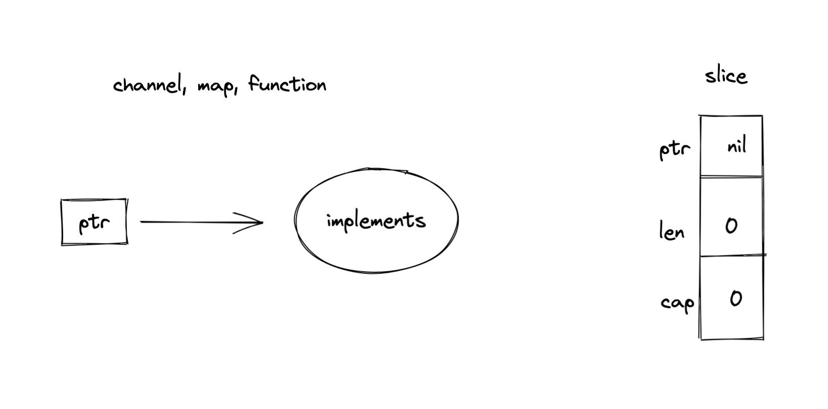 channel、map、function 和 slice 的本质都是在使用指针,所以也可以使用 nil 来判断这些类型是否初始化、是否能使用。slice 特殊一点,还有 len 和 cap 两个属性,但不影响 nil 的判断: