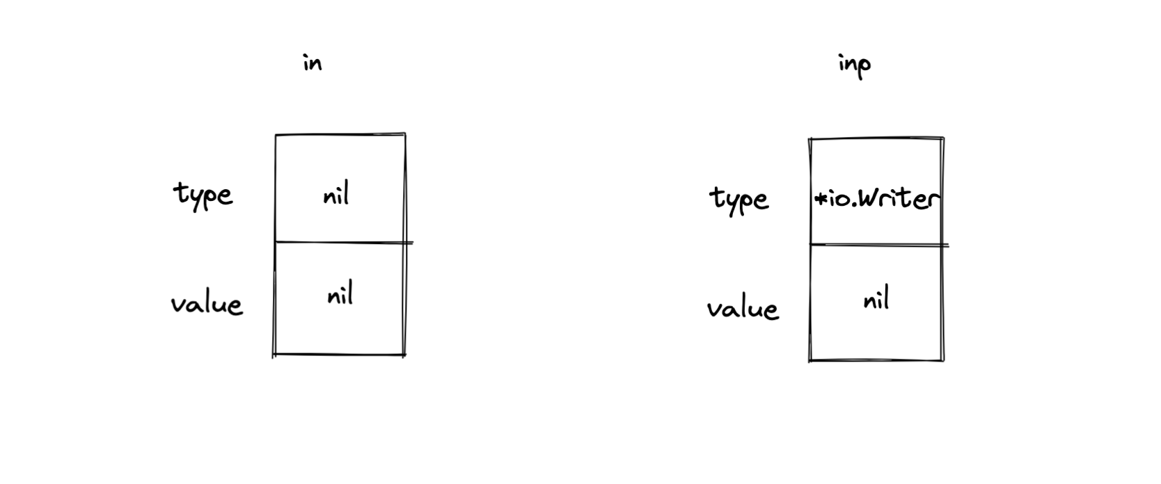 inP 的 type 不是 nil,那么 inP 就不等于 nil。在使用接口时要注意,只有接口的类型和值都是 nil 时,这个接口才等于 nil,否则不相等。