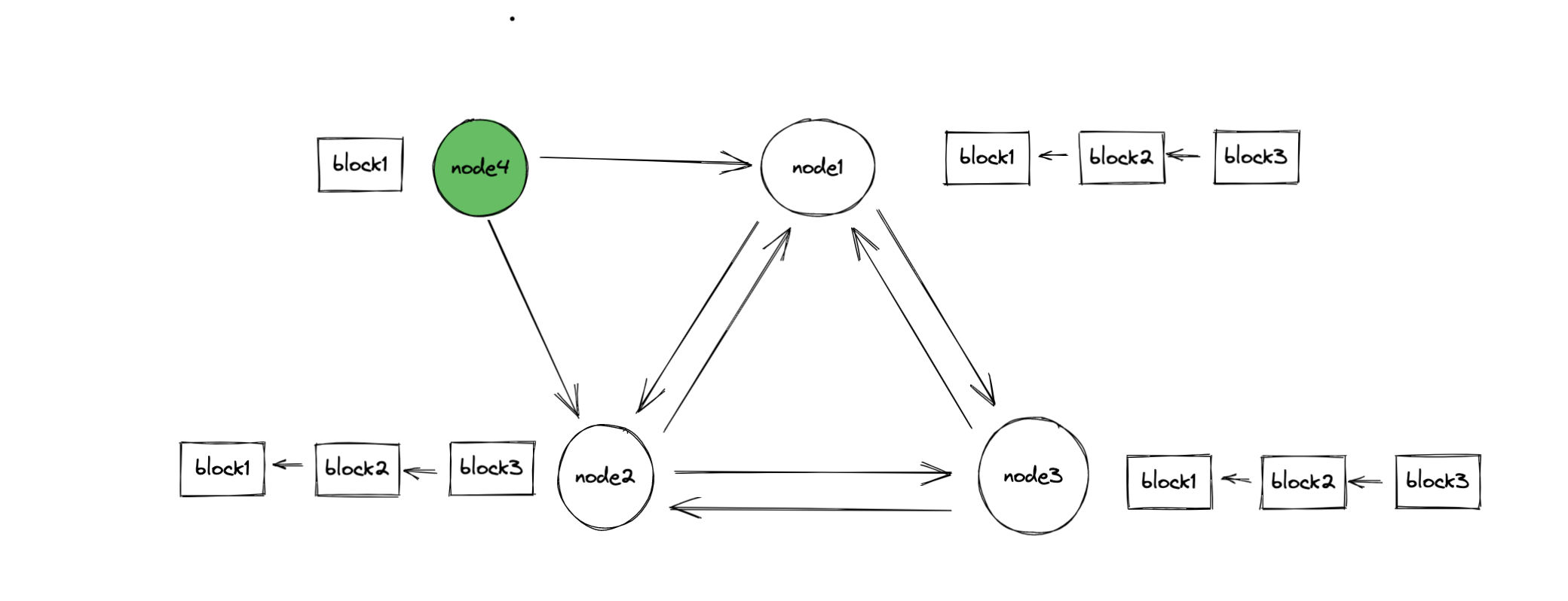 在区块链网络中,每个网络节点都会维护上面的那个链状的结构。节点之间会相互同步数据,最终每个节点所维护的数据是一模一样的。