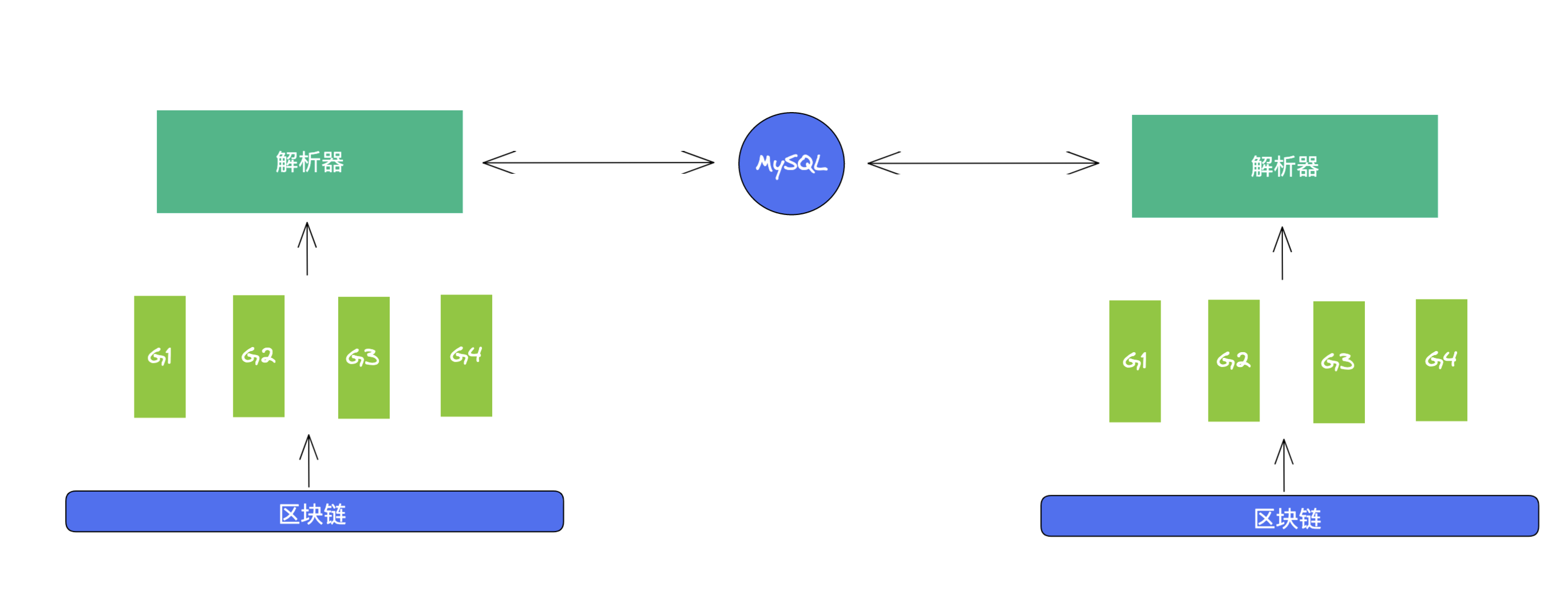 当一笔交易上链之后,就会存储到链上的账本中,但是账本中的数据无法直接展示。所以需要对这些账本数据进行解析,并存储,然后再从不同的维度去做对数据进行展示。系统本身并不会很复杂,整体的设计如下: